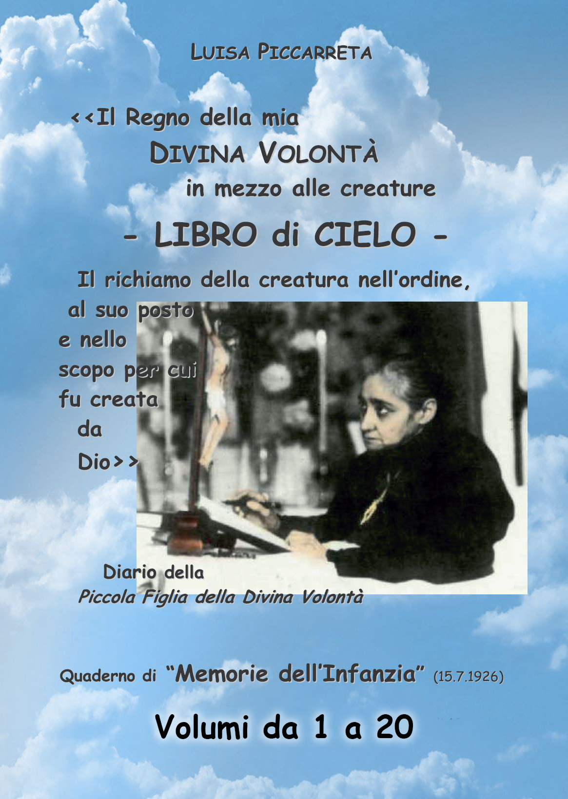 LIBRO di CIELO – Volumi da 1 a 2048,00 € Libro di Cielo - Volume 1 “Il Regno della mia Divina Volontà in mezzo alle creature. Il richiamo della creatura nell’ordine, al suo posto e nello scopo per cui fu creata da Dio.” Il primo volume della raccolta degli scritti di Luisa Piccarreta introduce alla conoscenza e alla meditazione della Divina Volontà. Questo volume rappresenta il punto di partenza per comprendere il cammino spirituale proposto dalla mistica di Corato, con contenuti che invitano a vivere in piena comunione con Dio attraverso l’abbandono totale alla Sua Volontà. Perfetto per chi desidera iniziare il percorso alla scoperta di un rapporto più intimo e profondo con il divino, il Volume 1 offre riflessioni e insegnamenti per avvicinarsi a una vita di fede autentica e trasformare l’ordinario in straordinario. Libro di Cielo - Volume 2 / 3 “Per ordine del confessore incomincio a scrivere ciò che passa tra me e Nostro Signore giorno per giorno.” I volumi 2 e 3 approfondiscono temi centrali come l’importanza della preghiera, l’abbandono fiducioso e la trasformazione interiore che deriva dal vivere secondo la Volontà di Dio. Con parole semplici ma cariche di significato, questa opera è un prezioso strumento per chi desidera avanzare nel cammino spirituale iniziato con il primo volume. Un viaggio unico nella spiritualità cristiana e nella chiamata a vivere nell’ordine divino. Libro di Cielo - Volume 4 Continua a venire il mio dolcissimo Gesù. Questa mattina, appena venuto ha voluto versare un poco le sue amarezze in me, e poi mi ha detto: “Figlia mia, io voglio dormire un poco, e tu fa il mio uffizio di soffrire, pregare e placare la giustizia”. Il quarto volume degli scritti di Luisa Piccarreta prosegue il percorso di approfondimento della Divina Volontà, guidando il lettore verso una maggiore comprensione della vita spirituale incentrata sull’unione con Dio. In questo volume, Luisa condivide esperienze mistiche e rivelazioni che illuminano il significato della vita vissuta in totale abbandono alla Volontà Divina. Con riflessioni profonde e insegnamenti ispirati, il Volume 4 diventa una guida essenziale per chi desidera continuare il cammino spirituale iniziato nei volumi precedenti. Libro di Cielo - Volume 5 / 6 / 7 “Questa mattina, dopo aver passato giorni amarissimi, il benedetto Gesù è venuto e si tratteneva con me familiarmente, tanto che io credevo di doverlo possedere sempre; ma quando al meglio, come un lampo è scomparso.” Nei volumi 5-6-7, Luisa continua a esplorare i temi della preghiera e della vita in unione con Dio, offrendo ai lettori i racconti delle sue visioni e riflessioni pratiche per applicare gli insegnamenti spirituali nella vita quotidiana. Ogni pagina è un invito a crescere nella fede e a sperimentare una trasformazione interiore attraverso l’abbandono totale alla Volontà Divina. Libro di Cielo - Volumi 8 / 9 / 10 Solo Dio può infondere pace nell’anima. Questa raccolta riunisce i volumi 8, 9 e 10 del Libro di Cileo. Attraverso queste pagine, Luisa condivide nuove rivelazioni e insegnamenti che illuminano la vita spirituale e il rapporto tra l’anima e Dio. I temi centrali includono l’amore infinito di Dio per l’umanità, la necessità di vivere in totale armonia con la Sua Volontà e la trasformazione spirituale che ne deriva. I volumi 8, 9 e 10 sono una guida preziosa per chi desidera proseguire il percorso spirituale con una maggiore comprensione e applicazione pratica degli insegnamenti di Luisa. Libro di Cielo - Volume 11 Continuando il mio solito stato, il mio adorabile Gesù Si faceva vedere Crocifisso con un’anima vicina, la quale si offriva vittima a Gesù; e Gesù le ha detto: “Figlia mia, ti accetto vittima del dolore. Tutto ciò che potrai soffrire, lo soffrirai come se stessi con Me sulla croce, e con le tue sofferenze Mi solleverai” Il volume 11 del Libro di Cielo rappresenta una tappa fondamentale nel cammino spirituale proposto da Luisa Piccarreta. Attraverso queste pagine, l'autrice continua a esplorare il mistero della Divina Volontà, rivelando profondi insegnamenti e nuove visioni che ispirano una vita in perfetta armonia con Dio. Il volume si concentra sull'importanza dell'amore totale e incondizionato verso il Creatore, incoraggiando i lettori a intraprendere un percorso di abbandono spirituale che conduce alla trasformazione interiore. Una lettura imprescindibile per chi desidera approfondire il legame con la Divina Volontà. Libro di Cielo - Volume 12 “Quante più pene [l’anima soffre], tante più comunicazioni acquista con Gesù. Chi fa la Divina Volontà sta con Gesù nel tabernacolo.” Il volume 12 del Libro di Cielo è - insieme al volume 11 - un altro passo molto importante per comprendere appiano il cammino spirituale di Luisa Piccarreta. Lo scritto si distingue proprio per l’intensità delle sue rivelazioni e la profondità degli insegnamenti spirituali. In queste pagine, la mistica affronta temi chiave come la relazione tra l’anima e il tempo eterno di Dio, mostrando come la Divina Volontà possa trasformare ogni aspetto della vita quotidiana. Libro di Cielo - Volume 13 / 14 “Il corpo straziato di Gesù è il vero ritratto dell’uomo che commette peccato. Gesù nella flagellazione si fece strappare a brandelli le carni, si ridusse tutto una piaga per donare di nuovo la vita all’uomo.” I Volumi 13 e 14 segnano una nuova tappa nel percorso spirituale proposto da Luisa Piccarreta. In queste pagine, l’autrice svela con profondità e delicatezza il valore della totale adesione alla Divina Volontà, guidando il lettore attraverso rivelazioni che illuminano il rapporto tra l’anima e Dio. Questi volumi affrontano temi centrali come l’importanza dell’amore universale, l’offerta delle proprie azioni quotidiane a Dio e la trasformazione spirituale che nasce dal vivere immersi nella Sua Volontà. Con uno stile toccante e ispirato, Luisa invita ogni an